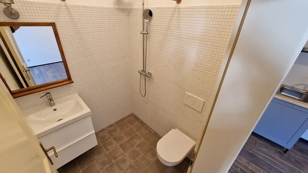 V bytě se topí elektrikou a je i klimatizovaný. Vybavený kuchyňskou linkou a samozřejmě koupelnou.