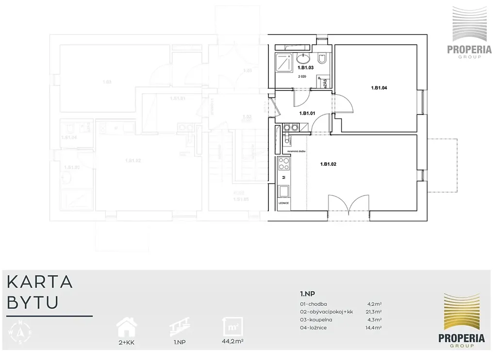 Nabízíme vám apartmán v 1.NP o dispozici 2+KK a CP 44,2 m².