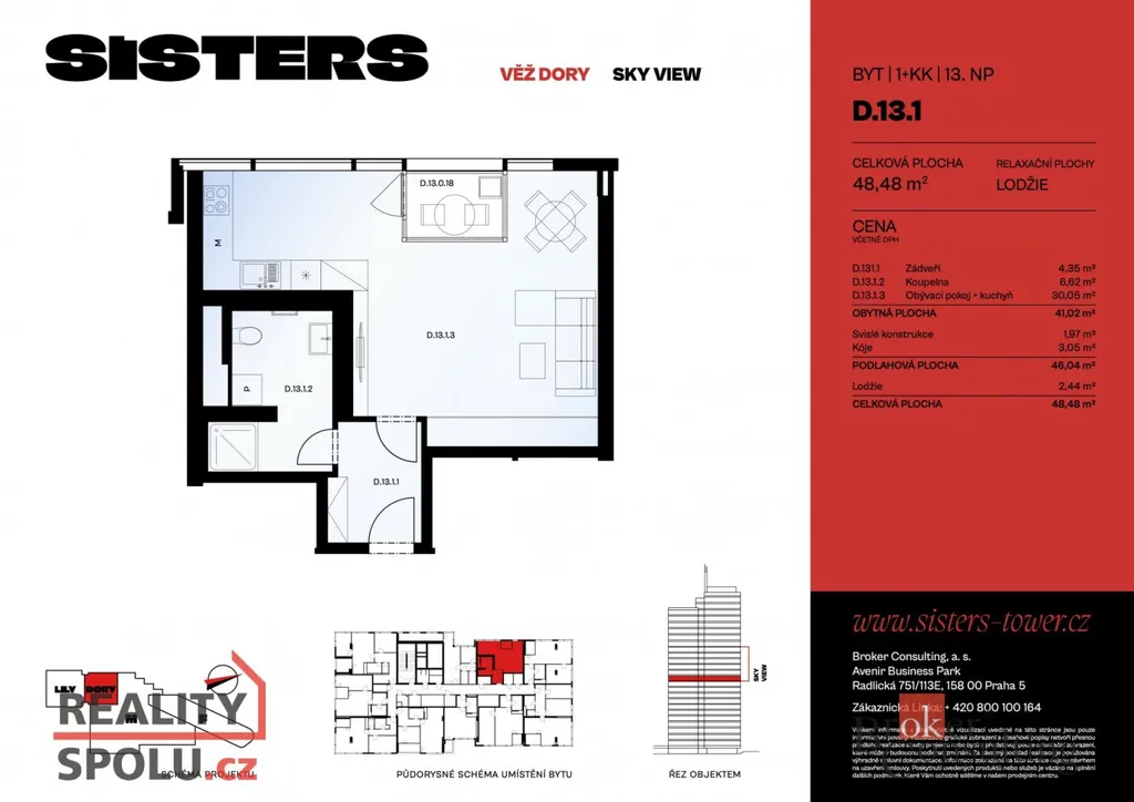 Na prodej byt 1+kk ve 13. nadzemním podlaží třetí nejvyšší budovy v ČR, projektu Sisters Tower Plzeň. Dům přináší technologický a komfortní standard, jaký v Plzni nemá obdoby. Byt je vybaven klimatizací, rekuperací, nízkoemisními okny a podlahovým vytápěním, díky čemuž zajišťuje ideální vnitřní prostředí po celý rok. Vše řízení systémem pro chytrou domácnost Loxone. Součástí každého z bytů je sklepní kóje a možnost dokoupení parkovacího stání v podzemních garážích.