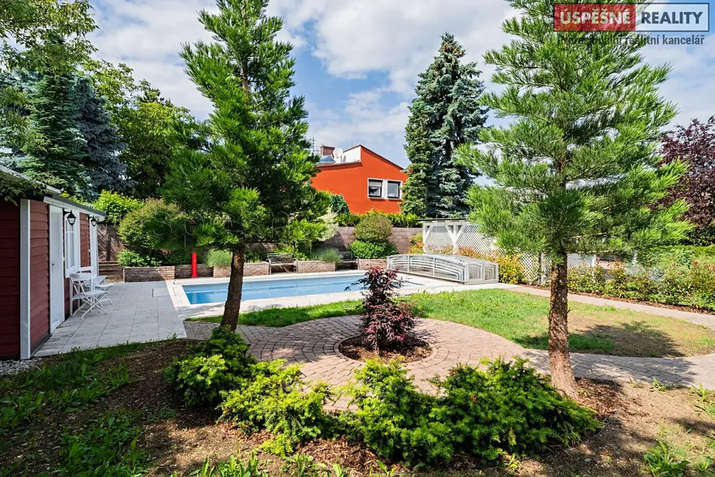 Dispozice domu: 1.PP Sklepní prostor. 1.NP, vstupní hala, obývací pokoj s kuchyní, ložnice, koupelna, technická místnost. 2.NP ložnice 2x, koupelna, technická místnost s kotlem a s elektronickým zabezpečovacím systémem, šatna a vstup na půdu. Vytápění domu a ohřev vody zajišťuje plynový kotel. Udržovaná zahrada s bazénem, zahradním domkem, vzrostlými okrasnými keři a stromy je situována kolem celého domu.