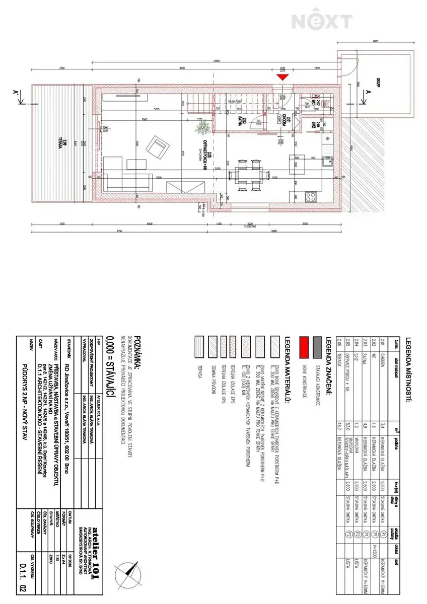 1. nadzemní podlaží – samostatná jednotka 2+kk (43,4 m²) s terasou 12 m²