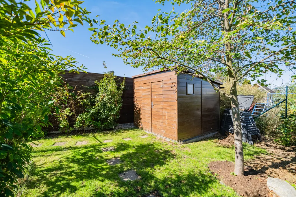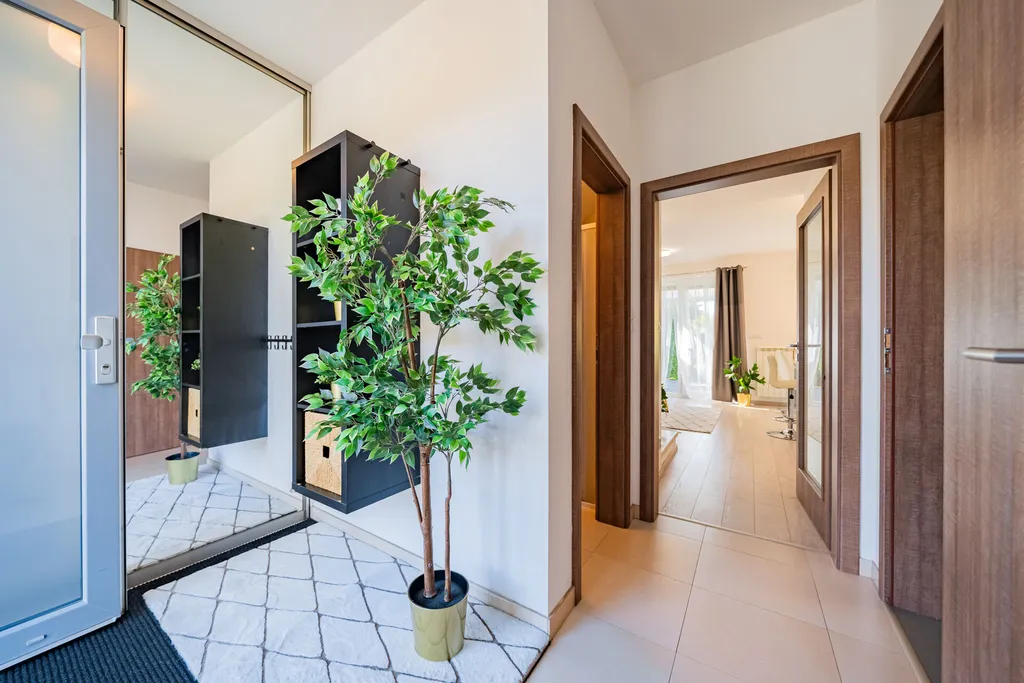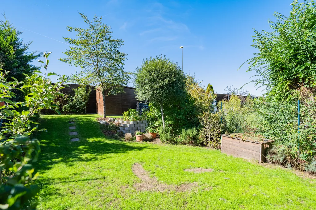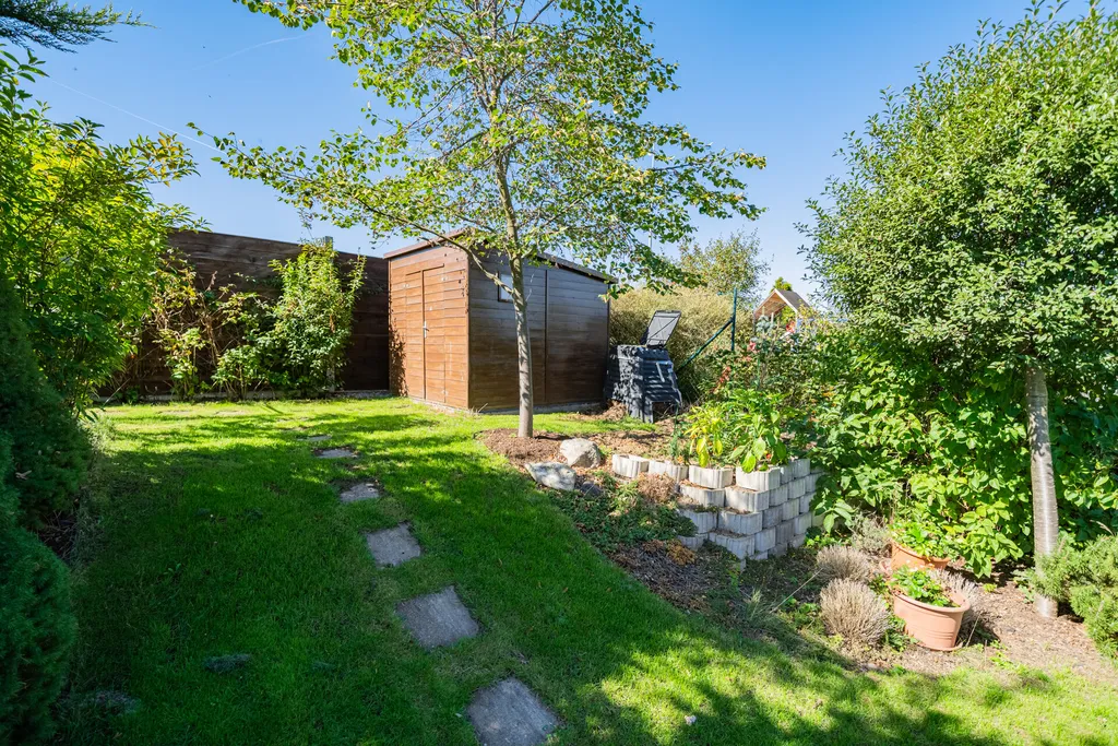 V přízemí domu je obývací pokoj s jídelnou, kuchyní, vstupem na terasu domu a dále do zahrady. Kuchyňská linka je vybavena spotřebiči ( varná deska, digestoř, trouba, mikrovlnná trouba, myčka nádobí, lednice, mrazák). Garáž domu je přístupná vraty na dálkové ovládání a je prakticky propojena dveřmi s interiérem domu, což poskytuje pohodlí v rámci nákupů a umožňuje jednoduché využití garáže v rámci úložného prostoru. V přízemí domu je vstupní chodba, koupelna se sprchou a toaletou. Patro domu má tři samostatné pokoje. V ložnici jsou vestavné skříně. Pokoje je možno využít dle vlastní potřeby, jako dětské pokoje, ložnice či pracovnu. V patře domu je další koupelna se sprchovým koutem a vanou. Toaleta je zde samostatná. V domě jsou předokenní žaluzie. Zahrada domu je velmi pečlivě udržovaná, rovinatá, zatravněná se vzrostlými stromy, dřevinami. Za zmínku stojí také maliny a rybíz. Zahrada má jednoduchý systém zavlažování. Výhodou je úložný domeček a především zastřešená terasa domu, která svým využitím reálně zvětšuje plochu domu.