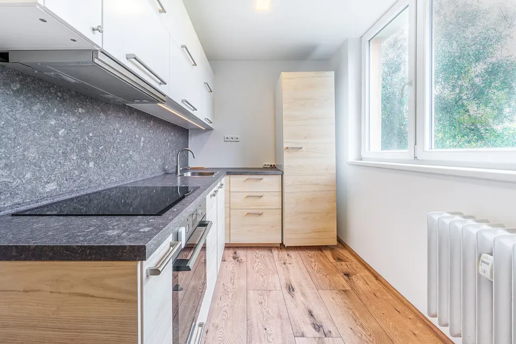 Byt nabízí velmi praktické uspořádání. Dva pokoje: jeden prostornější s balkónem, vhodný jako obývací pokoj a druhý pokoj, který je vhodný jako ložnice nebo pracovna, přičemž v obytných místnostech byly citlivě zrenovovány původní dřevěné parkety, které dodávají interiéru jedinečnou atmosféru. V ostatních částech bytu je položena moderní a odolná vinylová podlaha.