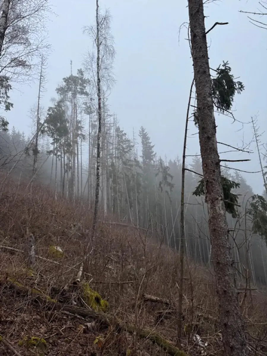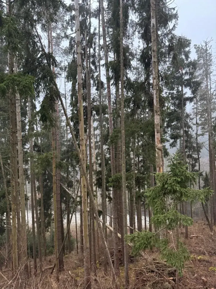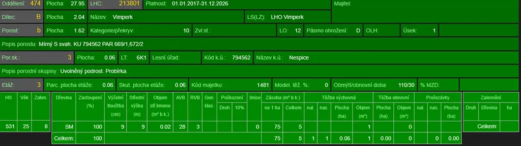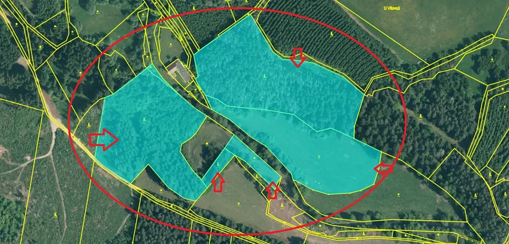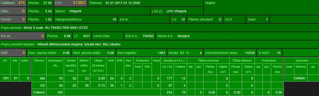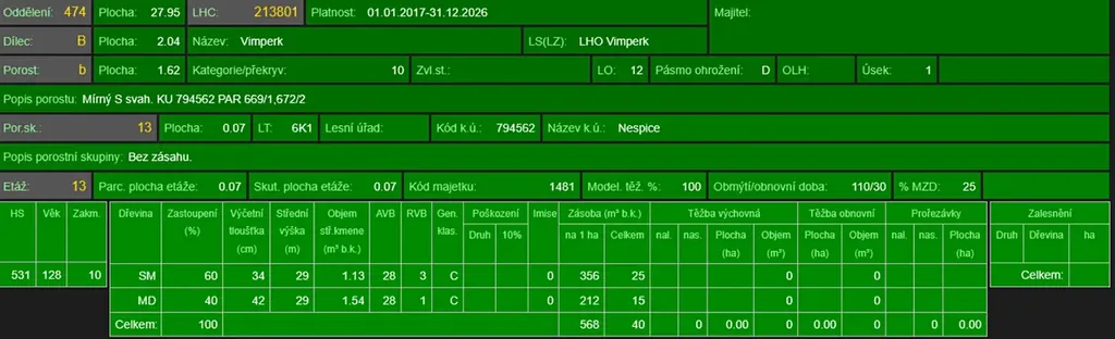 - p.č. 669/1 vedená jako lesní pozemek o celkové výměře 15 283 m2, z toho vlastníme podíl 1/2 tedy 7 642 m2 (stáří lesa 137 let - zastoupení dřevin smrk, modřín, stáří lesa 34 a 50 let - zastoupení dřevin smrk, stáří lesa 26 let - jeřáb, smrk, stáří lesa 17 let - jeřáb, bříza, keře, smrk),
