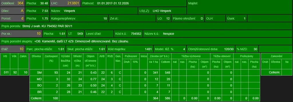 - p.č. 561/1 vedená jako lesní pozemek o celkové výměře 17 496 m2, z toho vlastníme podíl 1/2 tedy 8 748 m2 (stáří lesa 101 let - zastoupení dřevin smrk, modřín, borovice, bříza, stáří lesa 13 let - zastoupení dřevin smrk, javor),