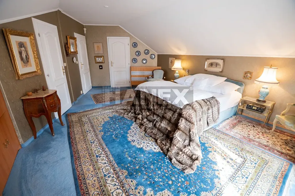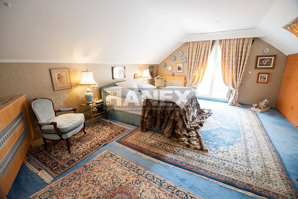 V patře je hlavní ložnice se šatnou, vlastní koupelnou a balkonem 11 m2, pokoj pro hosty se šatnou a koupelnou, další dva pokoje, koupelna a toaleta.