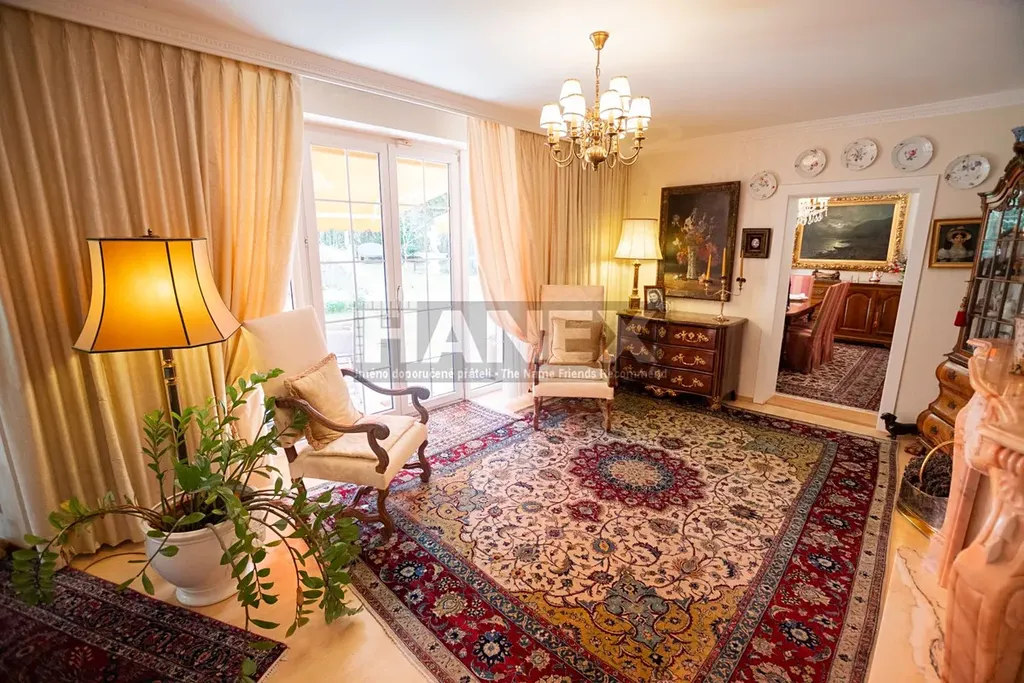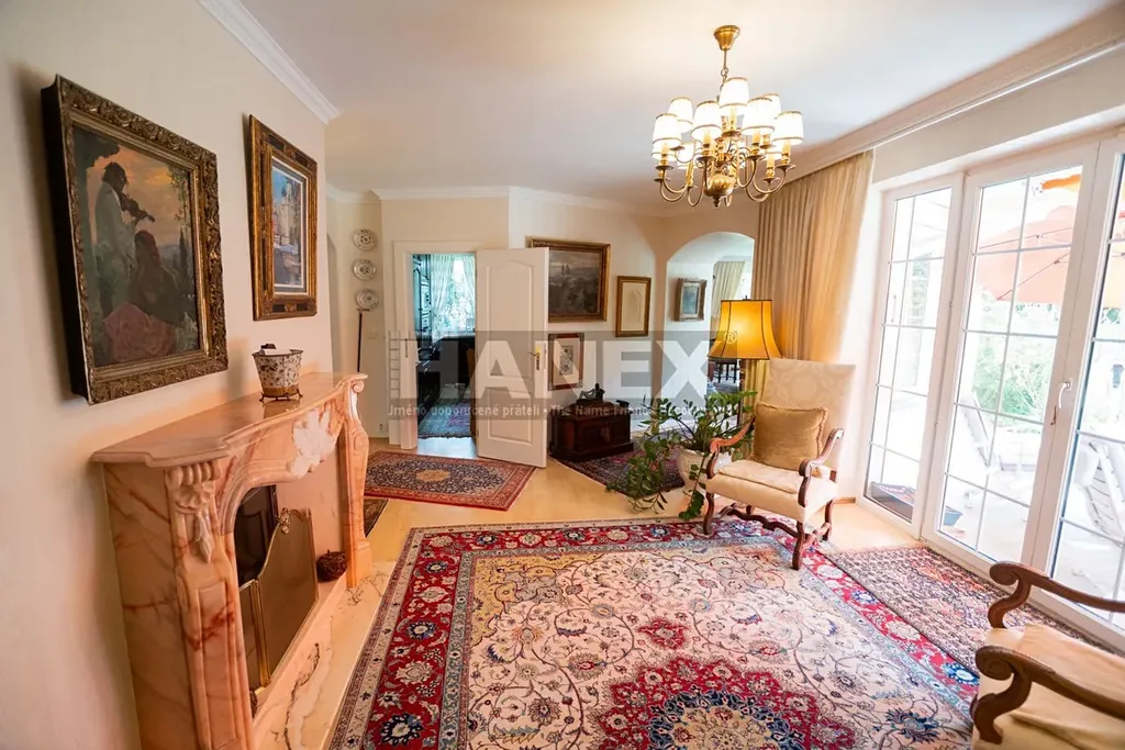 Vybavení domu: alarm, solární panely, funkční krb, venkovní rolety, sluneční markýzy, vestavěné kuchyňské spotřebiče, zahradní nábytek a technika, pojezdová brána a garážová vrata na dálkové ovládání, zámková příjezdová cesta, automatické zavlažování, studna na pozemku.