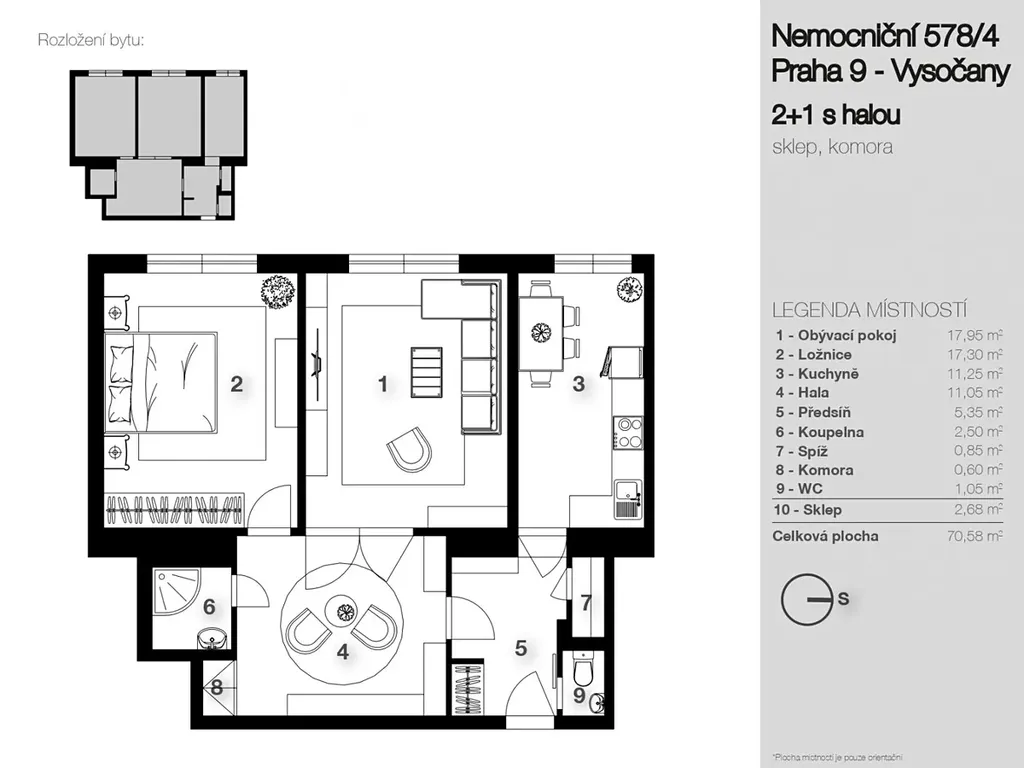 Nabízíme vám ke koupi vkusně revitalizovaný byt s prvorepublikovou atmosférou o dispozici 2+1 a halou o CP 70,6 m2 vč. příslušenství, na adrese Nemocniční 578/4, Praha 9 Vysočany.