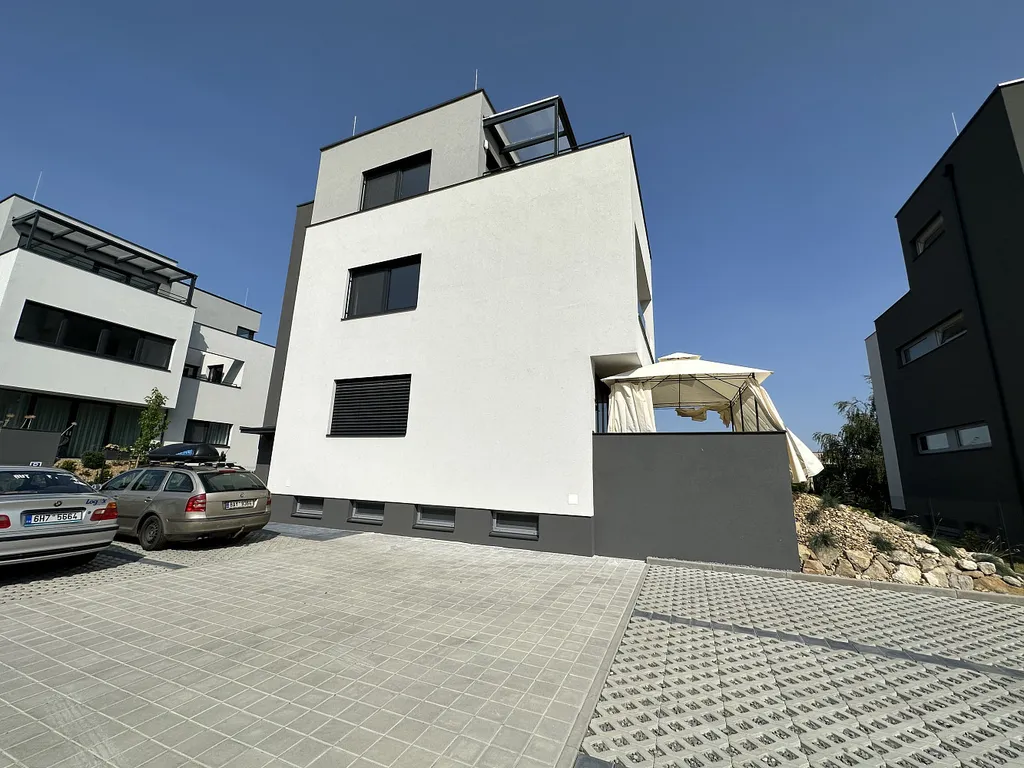 This modern apartment is on the 2nd floor and is partially furnished - kitchen with appliances, built-in wardrobes, complete lighting equipment, air conditioning, outdoor electric blinds, window nets against insects, video intercom, central water treatment plant (automatic softener). There are 2 private parking spaces on a fenced plot with the possibility of EV charger and there is also a cellar.