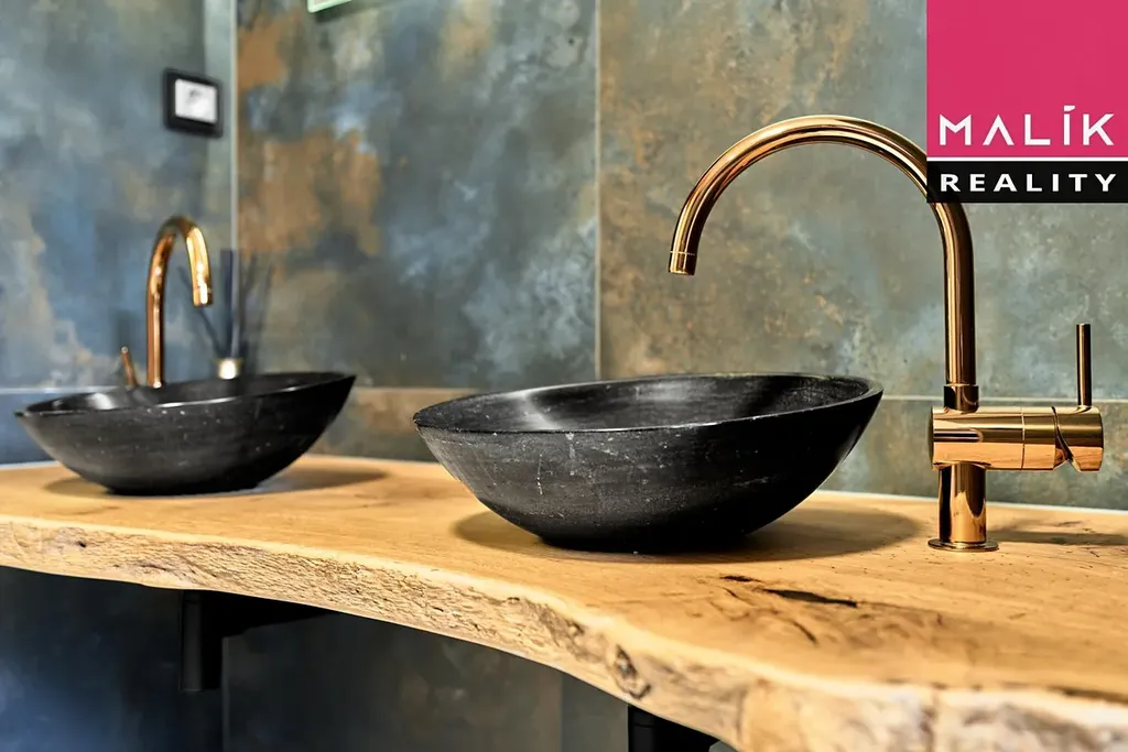 Designové prvky jsou patrné především v části koupelny, kde se nachází prostorný sprchový kout a velké zdvojené umyvadlo. Podlahové elektrické topení dokresluje kvalitní řešení rekonstrukce. Velikost koupelny, bezmála 9m2, je v podobných bytech velmi nestandardní, zde příjemně luxusní. Z chodby je vstup do moderní kuchyně a pokoje, který je dál průchozí do ložnice. V této místnosti je vstup na balkon. který Vám zpříjemní posezení při letních večerech.