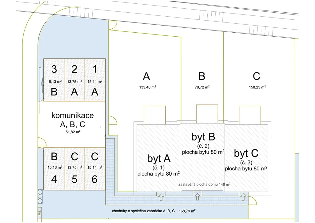 Jedná se o novostavbu rodinného domu (Energetická třída B - velmi úsporná) se třemi bytovými jednotkami. Každá z jednotek je se samostatným vchodem, ke každé náleží vlastní oplocená zahrádka s terasou a pergolou 3x3m s přímím vstupem z obývacího pokoje a zahradním domkem 2x2 m, dvě vymezená parkovací stání na uzavřeném/oploceném pozemku s pojezdovou bránou na DO.