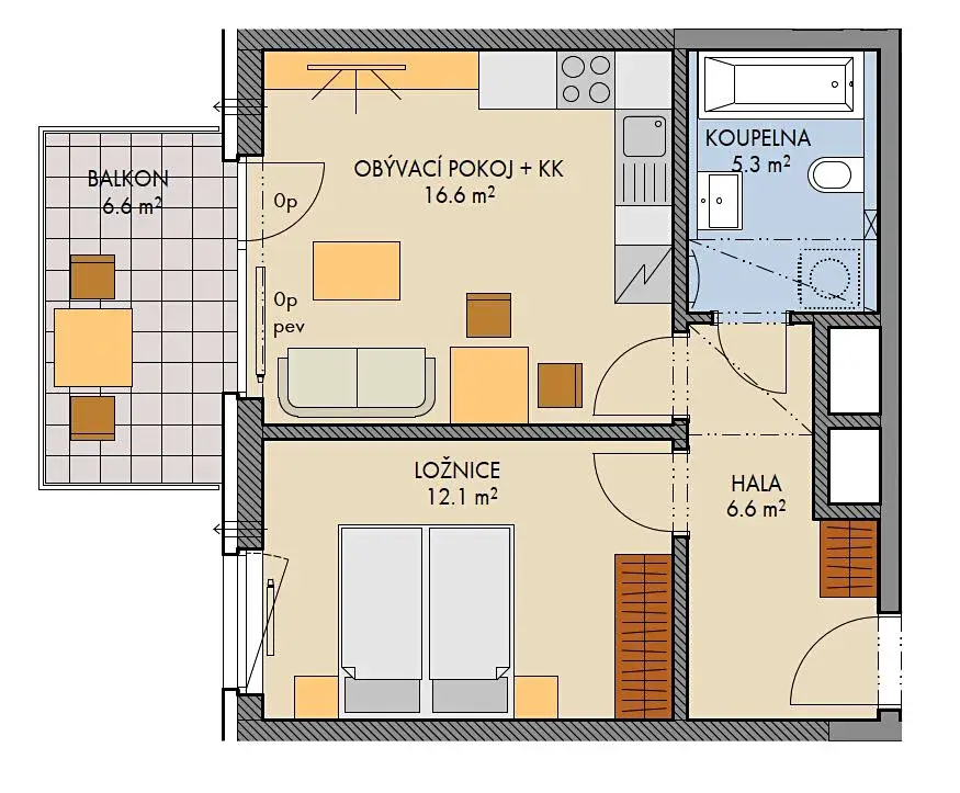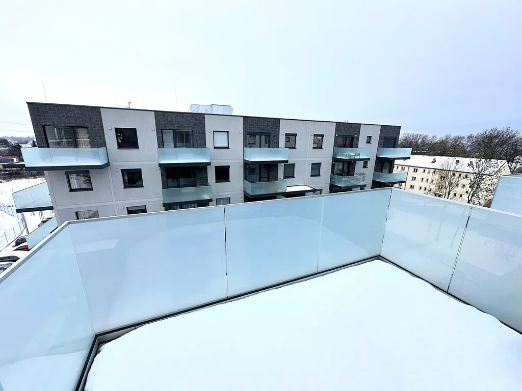 Byt 2kk o velikosti cca 42,6 m2 s nadstandardním balkónem cca 6,6 m2 má východní orientaci a díky umístění v posledním patře nabízí klid, dostatek světla po celý den a daleké výhledy.