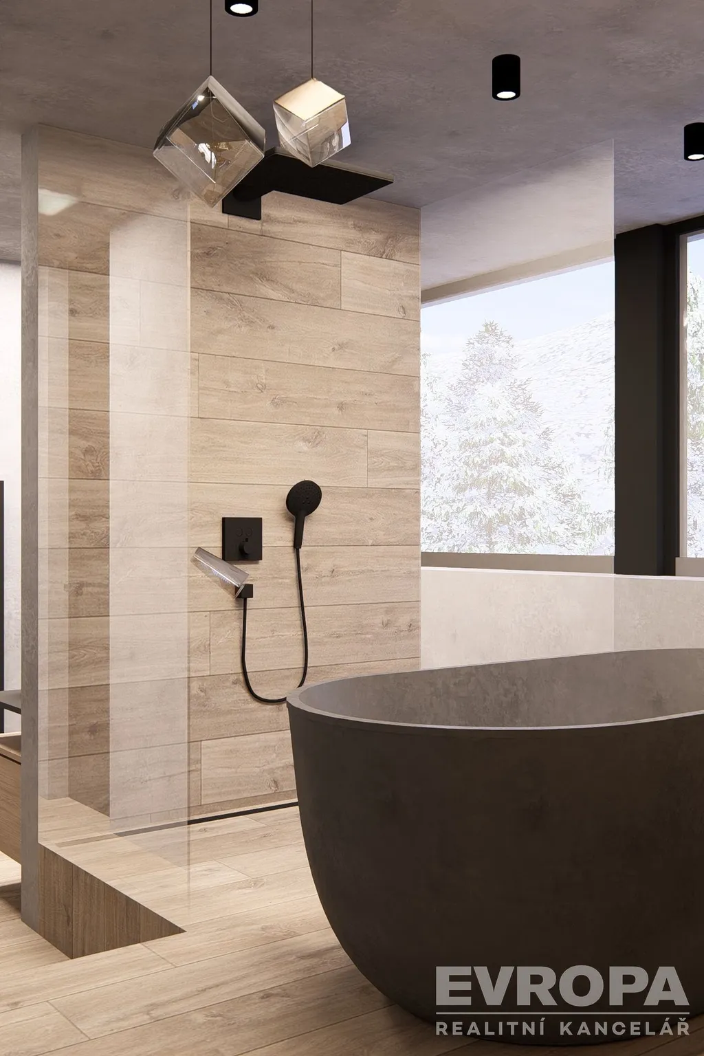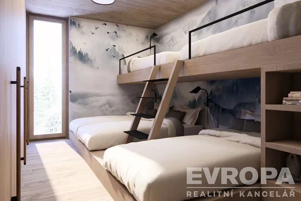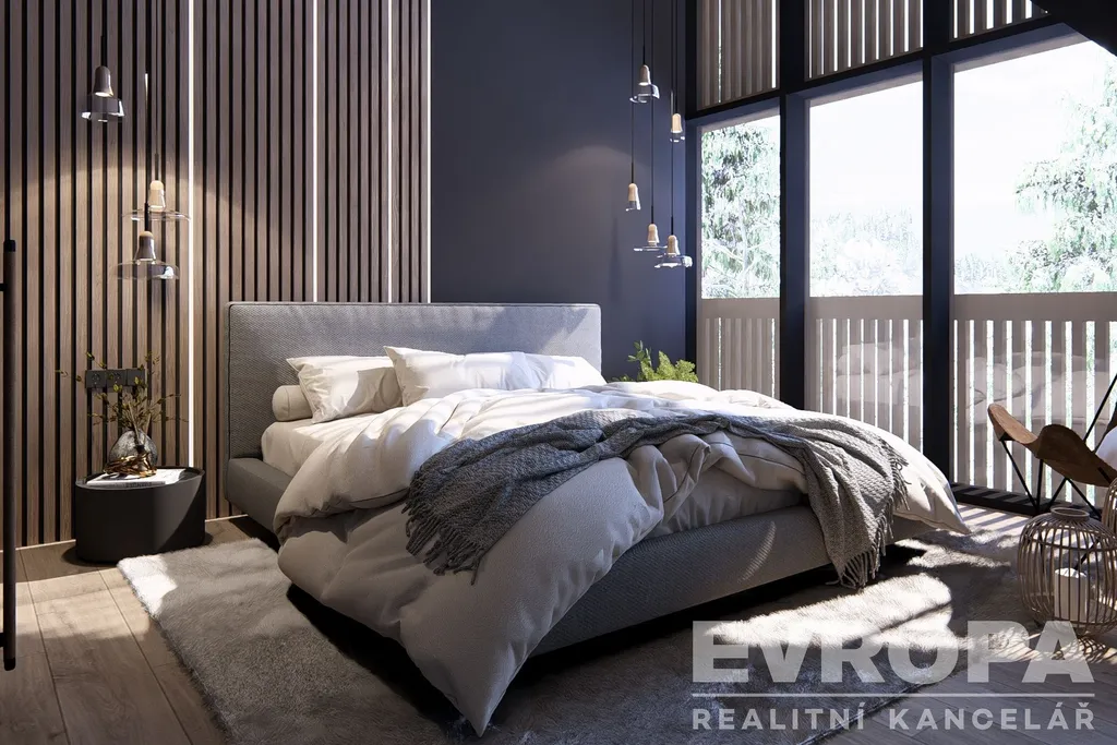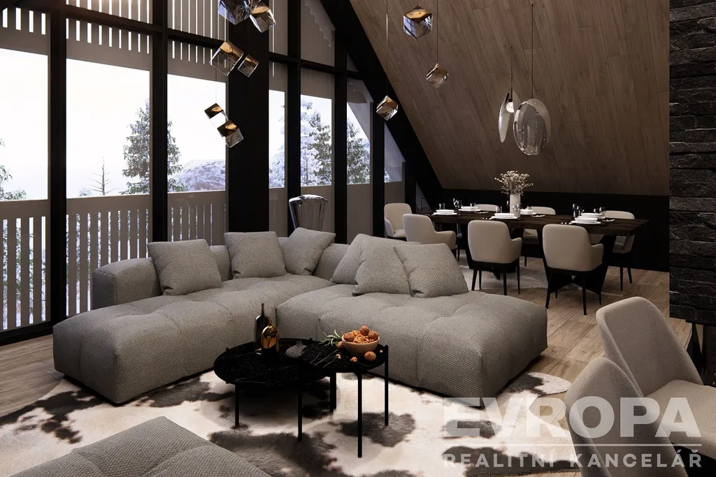 Dispozičně jednotka nabízí prostorný obývací pokoj s vysokými stropy, tři samostatné ložnice, tři koupelny s toaletami, šatnu a samostatnou saunu s jedinečným výhledem na sjezdovky. Z obývacího prostoru se otevírá dechberoucí panorama Krkonoš, které podtrhuje výjimečný charakter této nemovitosti. Dominantou obývacího pokoje bude klasický krb, jenž dotváří příjemnou horskou atmosféru a pocit útulného luxusu.