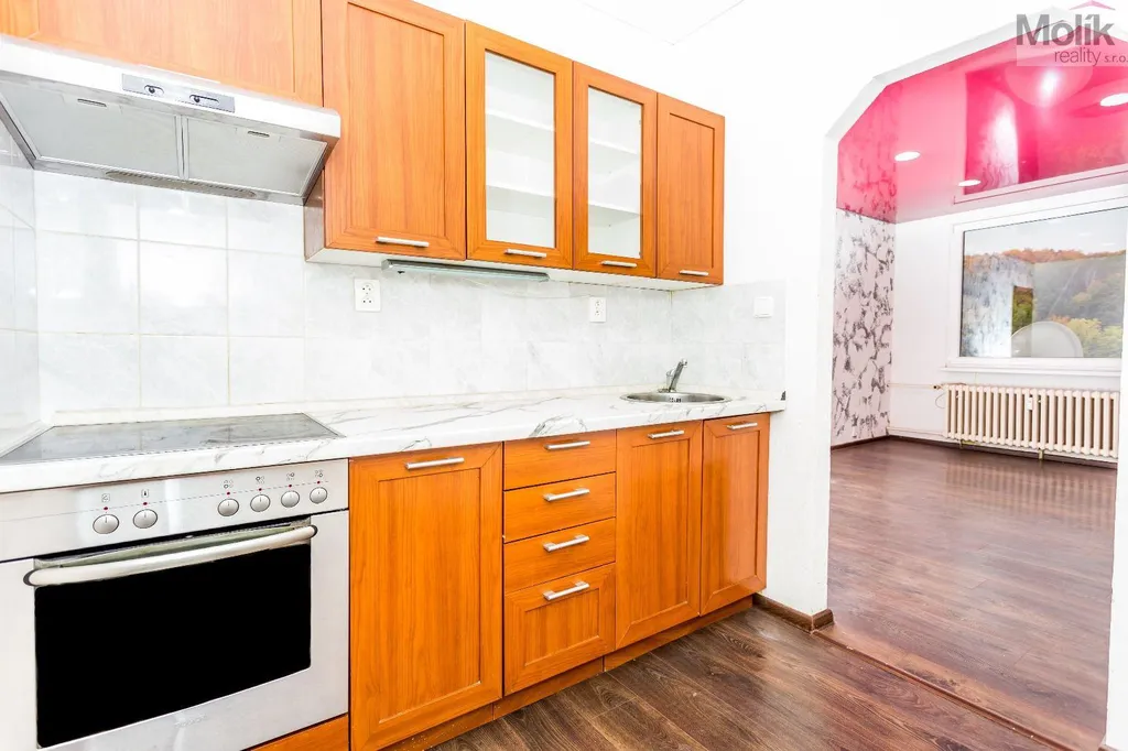 Byt prošel kompletní rekonstrukcí rozšíření koupelny, oddělení kuchyně od obývacího pokoje, nové rozvody vody, napínané fóliové stropy a nové podlahy.
