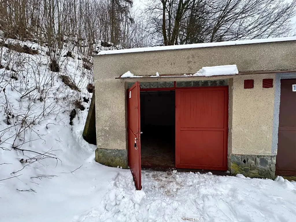Garáž má užitnou plochu cca 20 m², je vhodná pro parkování jednoho automobilu, případně jako sklad nebo menší dílna. Je suchá, bez přípojky elektřiny, nově vymalovaná, s dlažbou na podlaze. Disponuje menším větracím okénkem a udržovanými plechovými vraty, která jsou nově natřená.