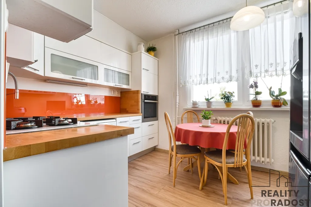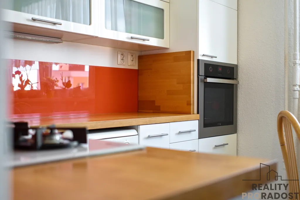 Kuchyňská linka do L kombinuje dekory lesklé bílé a pracovní desky z masivu. Součástí linky jsou i vestavěné spotřebiče - myčka, plynová varná deska, odsavač par, trouba, mikrovlnná trouba a granitový dřez s baterií. V kuchyni je dostatek prostoru na umístění jídelního stolu. Kuchyně je orientována do vnitrobloku do zeleně.