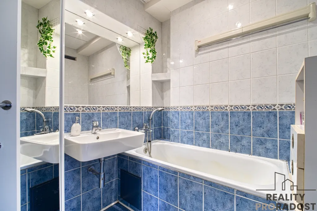V koupelně se nachází prostorná vana, umyvadlo, úložný prostor.