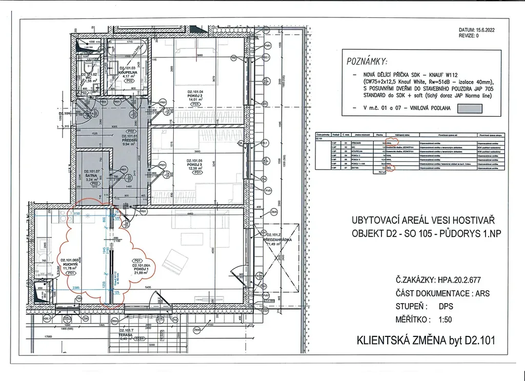 Původně byla jednotka koncipována jako 3+kk, ale v rámci klientských změn byla developerem upravena na 3+1 tj. 4x místnosti - možnost úpravy zpět na 3+kk tj. 3x místnosti.