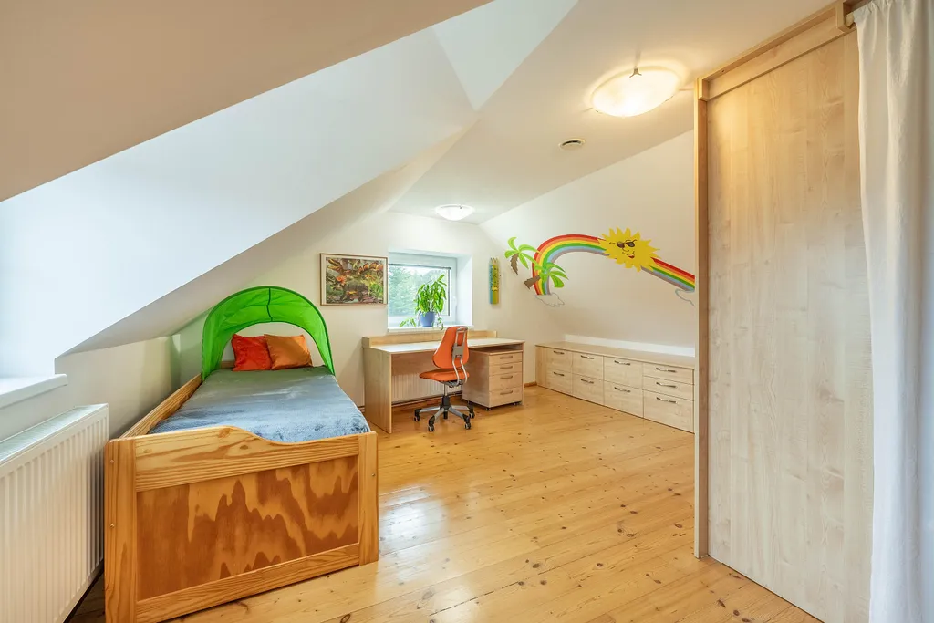 V prvním patře se nachází 2 pokoje, WC, malá šatna a velká průchozí šatna, která může sloužit jako další pokoj.