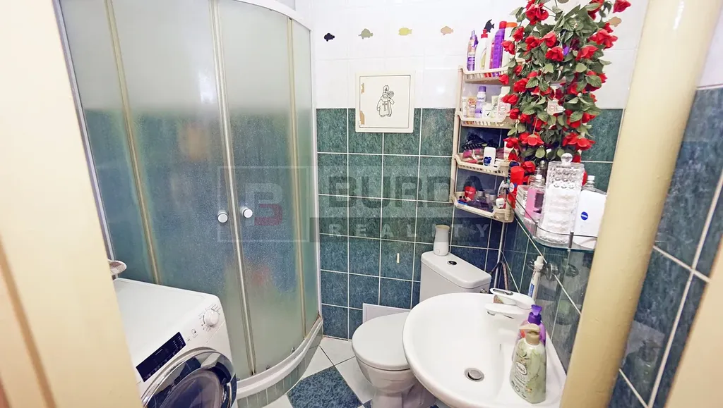 V koupelně je sprchový kout, WC, umyvadlo a přípojky pro pračku.