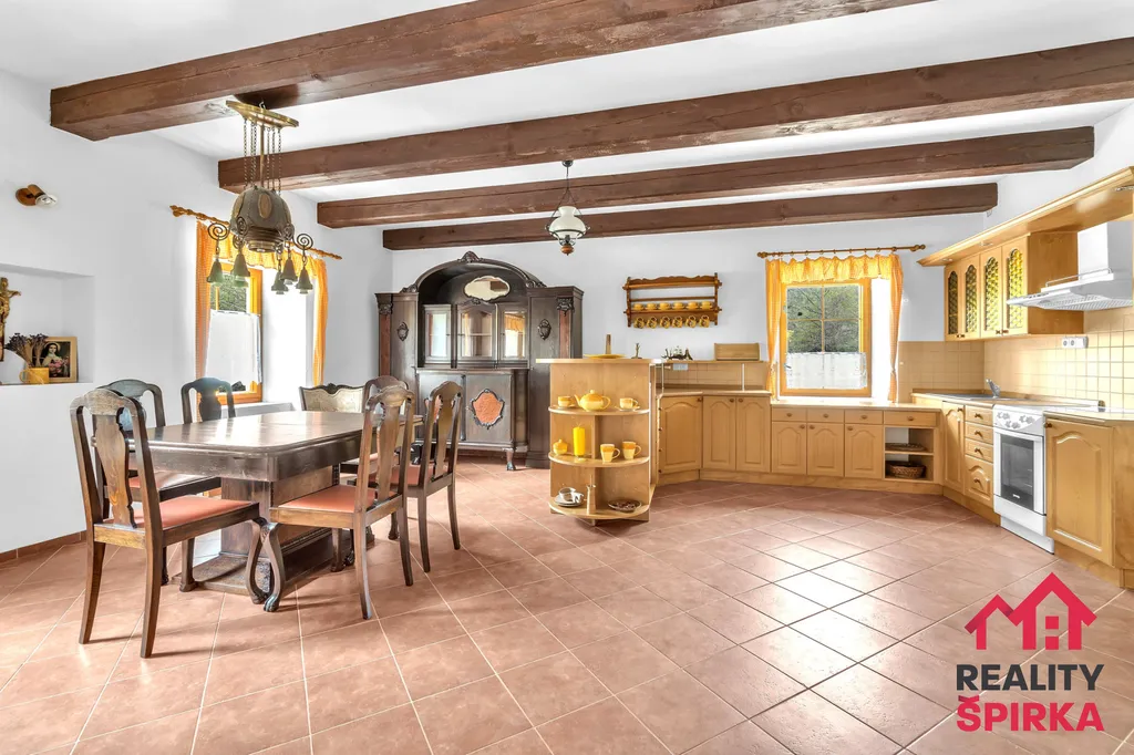 Jednotka 2+1 má útulnou kuchyň s krásnými kachlovými kamny, dvě prostorné místnosti, novou koupelnu, WC, spíž a místnost se sedačkou a výhledem do zeleně dvora. Nad tím vším se vznáší velká půda, ideální k dalšímu chalupářskému rozletu.