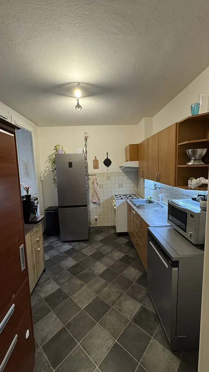 Dispozice nabízí obývací pokoj (plovoucí podlaha), prostornou ložnici, kuchyň, koupelnu (zděné jádro, vana, dlažba, obklad), chodbu a komoru v bytě, což je velmi dobrý úložný prostor či šatna. Dále k bytu náleží sklepní drátěná koje v suterénu domu. Přístup do bytu vede přes uzamykatelnou chodbu oddělenou od výtahů a schodiště, v domě jsou dva prostorné nové výtahy.