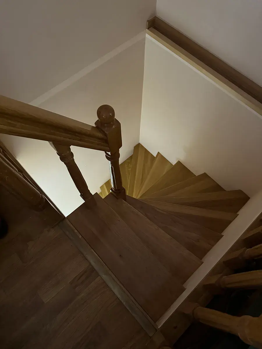 Horní podlaží: světlý obývací pokoj s kuchyňským koutem, ložnice, koupelna s vanou, předsíň a prostorná terasa s výhledem do zeleně. Z obou pokojů je přímý vstup na terasu. Podlahy z pravého dřeva, podlahové vytápění.