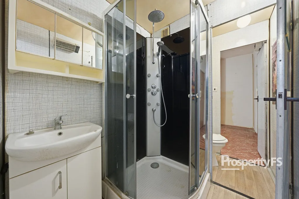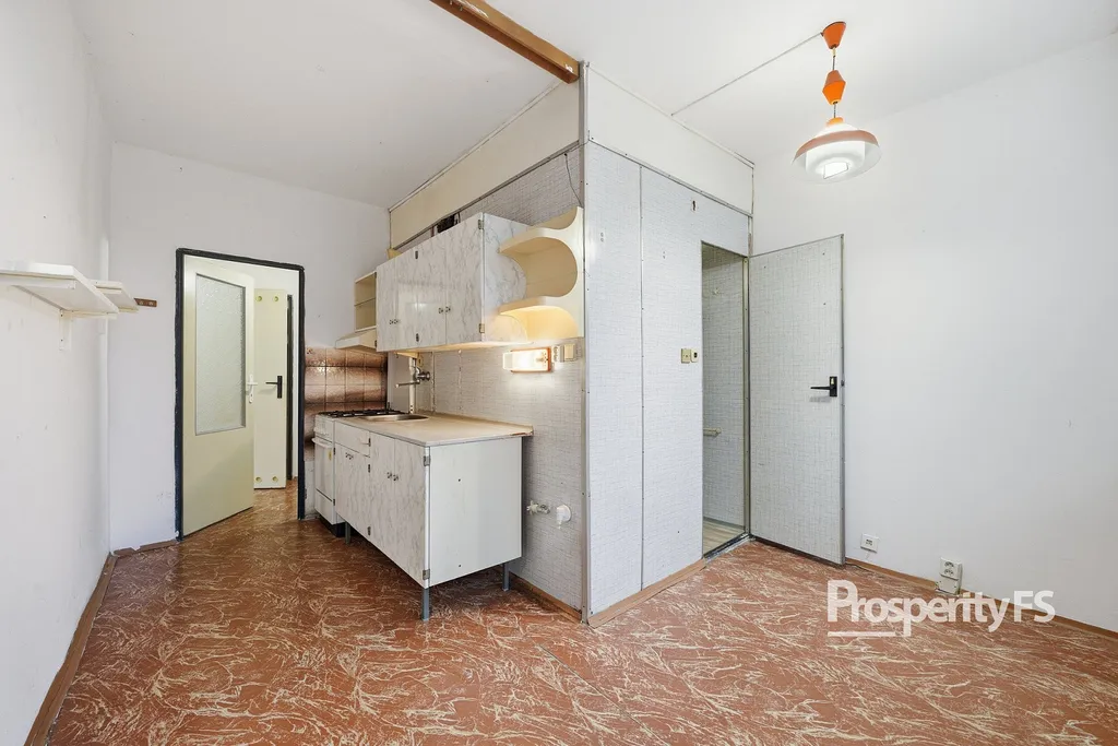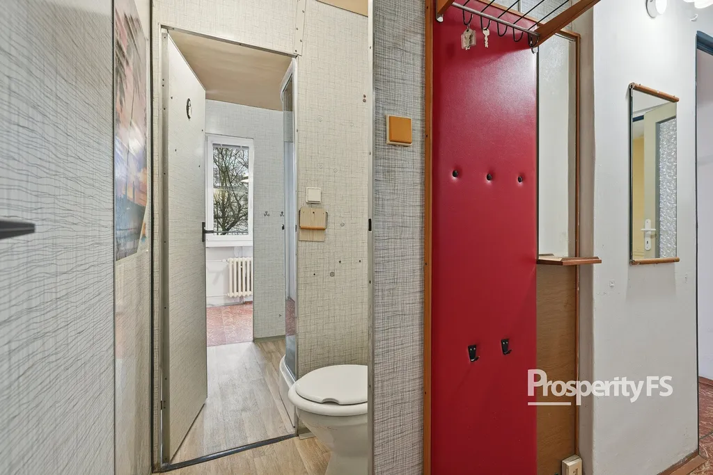 Koupelna je připravena ke kompletní modernizaci a byt dále nabízí praktický úložný prostor v podobě zděné šatny.