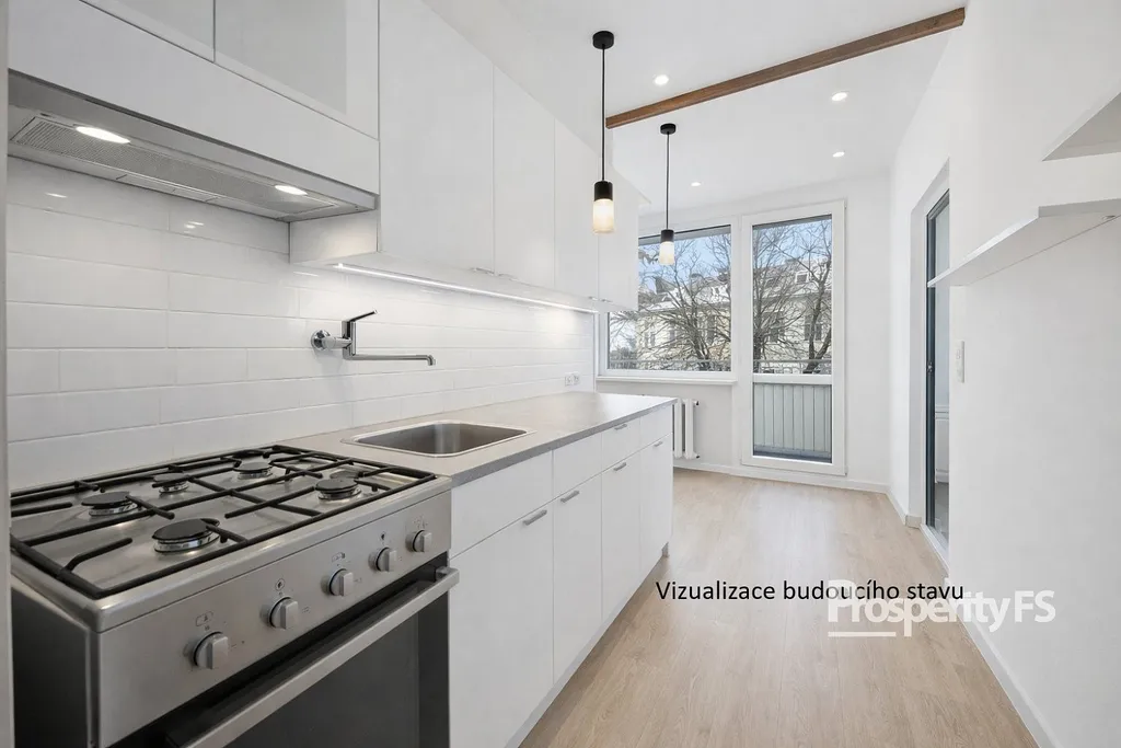 Součástí bytu je plnohodnotná kuchyně s prostorem pro jídelní stůl a vstupem na prostornou lodžii umístěnou s výhledem do zeleně.