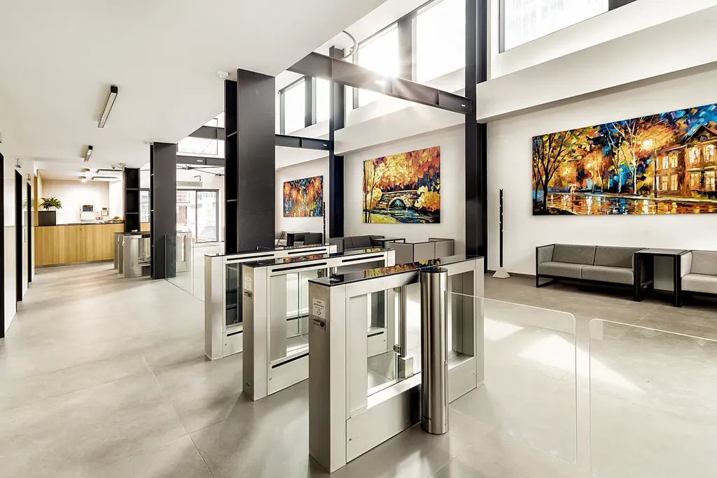 Budova umožňuje nepřetržitý přístup 24/7, poskytuje recepční služby, ostrahu objektu a bezpečný pohyb prostřednictvím čipových karet.