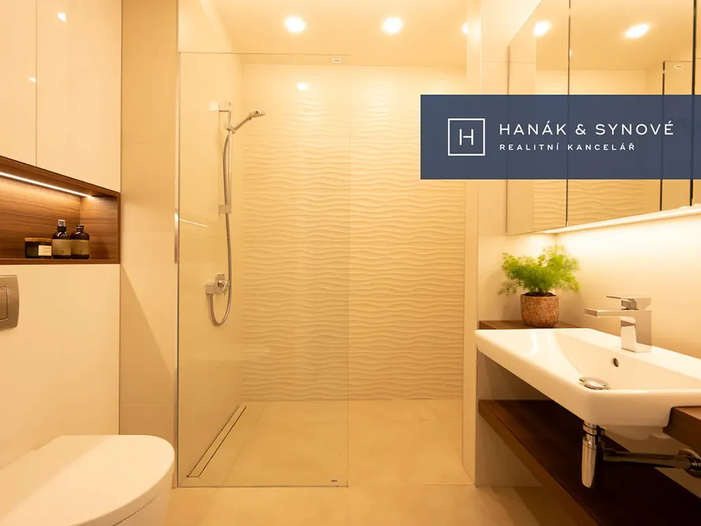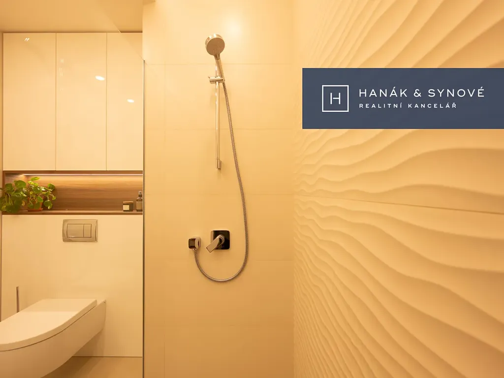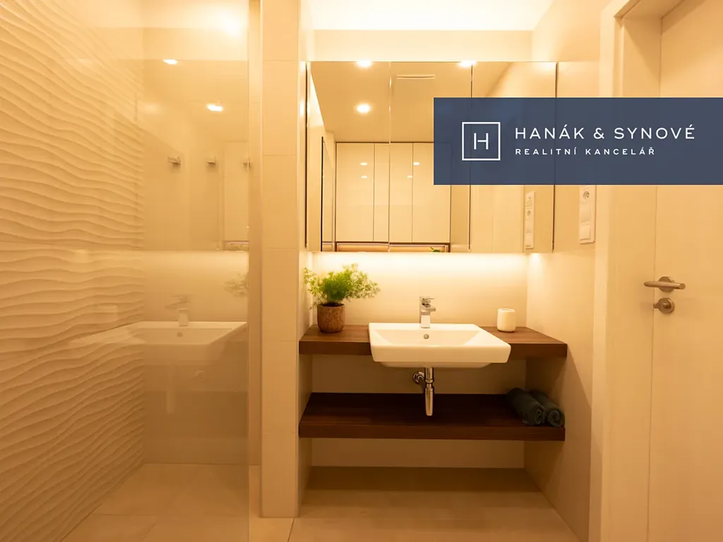 Byt je zařízený ve vysokém standardu a je nabízen částečně zařízený – kuchyňská linka se spotřebiči (varná deska, trouba, vestavěná lednice s mrazákem, pračka a sušička, myčka), vestavěná skříň, postel, venkovní žaluzie. Koupelna je vybavena walk-in sprchovým koutem se skleněnou zástěnou značky HÜPPE, záchodem a umyvadlem s umyvadlovou skříňkou, podsvíceným zrcadlem.