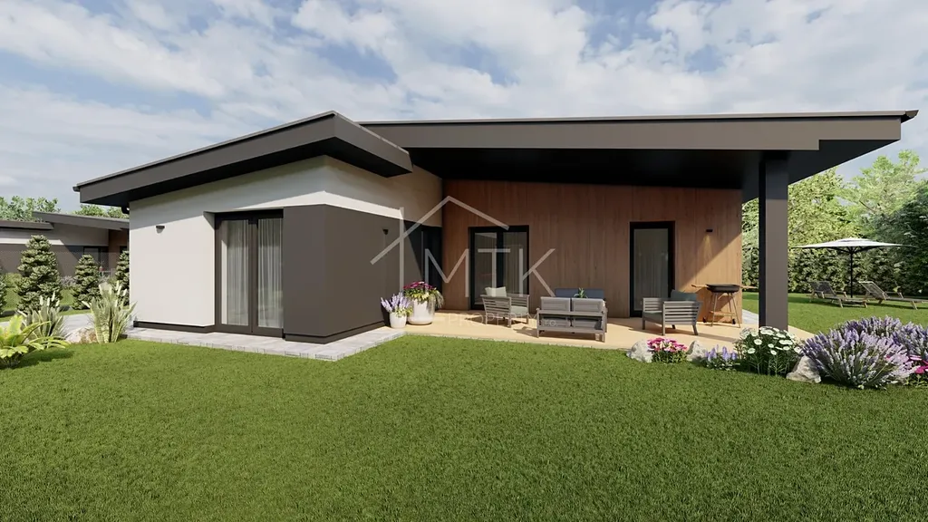 Jedná se o moderní přízemní rodinný dům s dispozicí 4+kk o užitné ploše 115,15 m², navržený s důrazem na funkčnost, světlo a pohodlí celé rodiny. Dominantou domu je prostorný obytný prostor s kuchyňským koutem, který přirozeně navazuje na terasu o velikosti 27,55 m² a zahradu na pozemku o rozloze 754 m², ideální pro odpočinek, rodinné posezení i letní večery.
