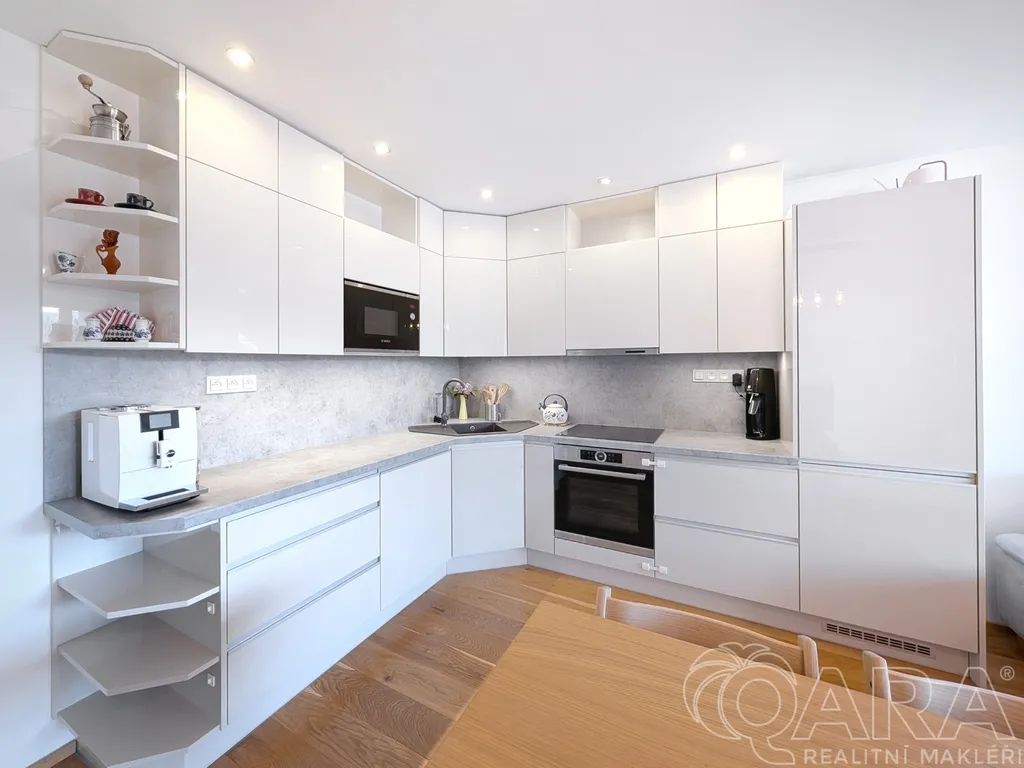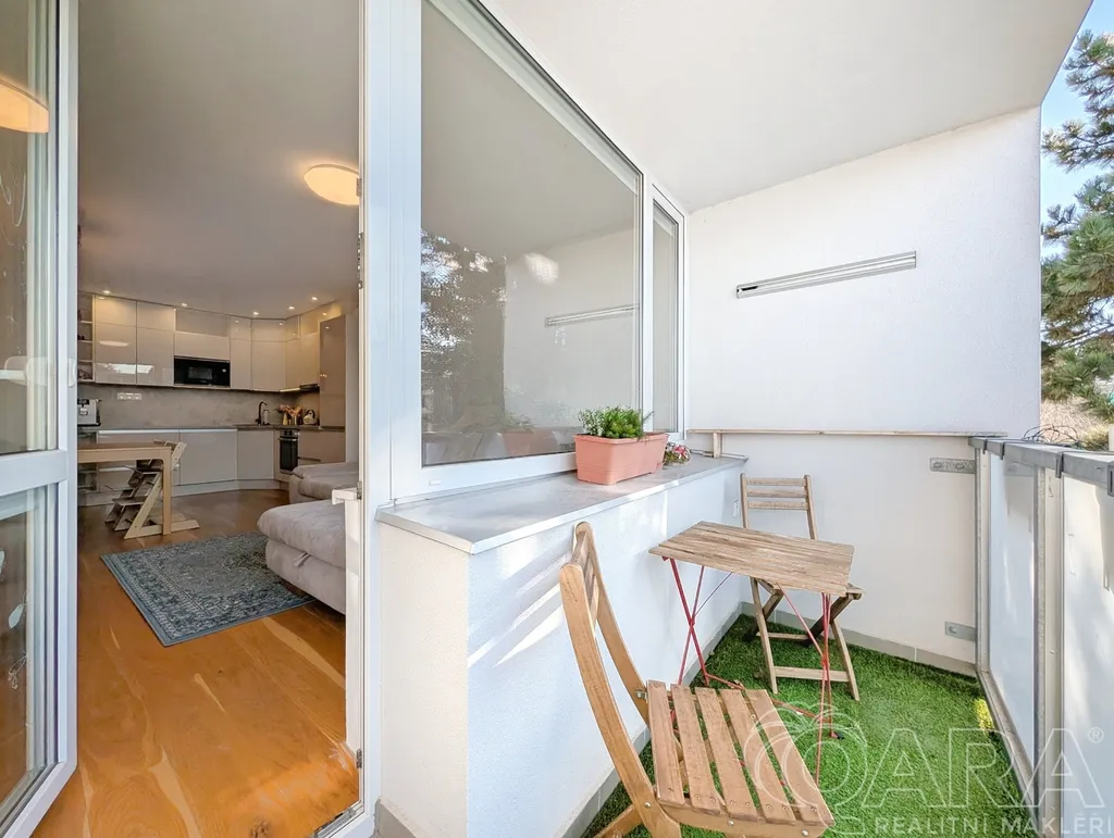 Dispozice bytu je praktická a vhodná jak pro rodinu, tak pro pár. Obývací pokoj má stěnu na míru a je propojen s kuchyňským koutem vybaveným vestavěnými spotřebiči (značky Bosch) a má přímý vstup na lodžii. Dalšími místnostmi jsou samostatná ložnice a dětský pokoj, ze kterého je vstup na druhou, zasklenou lodžii. Koupelna nabízí prostorný sprchový kout o rozměrech 140 × 90 cm, umyvadlo, WC, topný žebřík, přípojku na pračku a podlahové topení. V chodbě jsou umístěny vestavěné skříně poskytující dostatek úložného prostoru. Byt je vybaven bezpečnostními vstupními dveřmi a kvalitní dubovou podlahou.