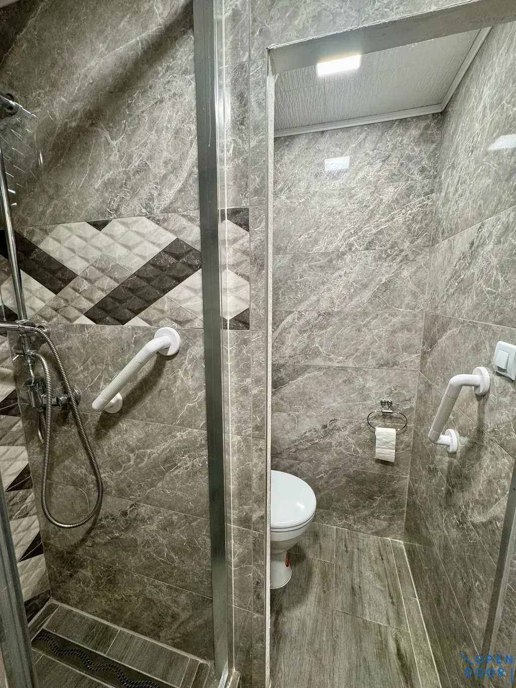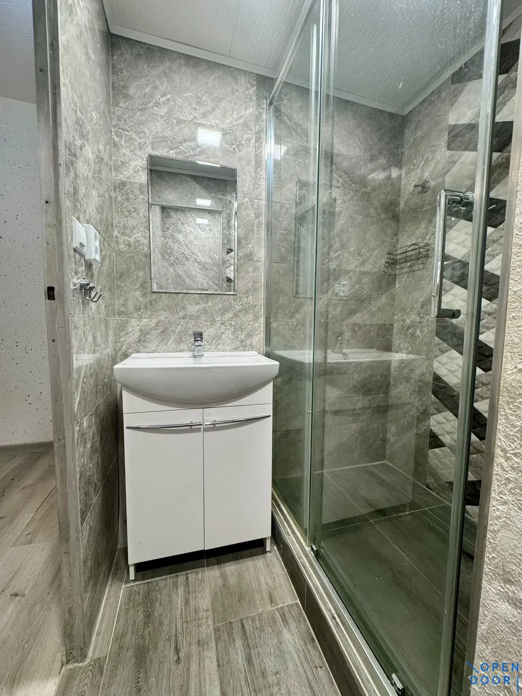 -koupelnu se sprchovým koutem se zasklenými dveřmi, umyvadlem se skříňkou, zrcadlem a WC
