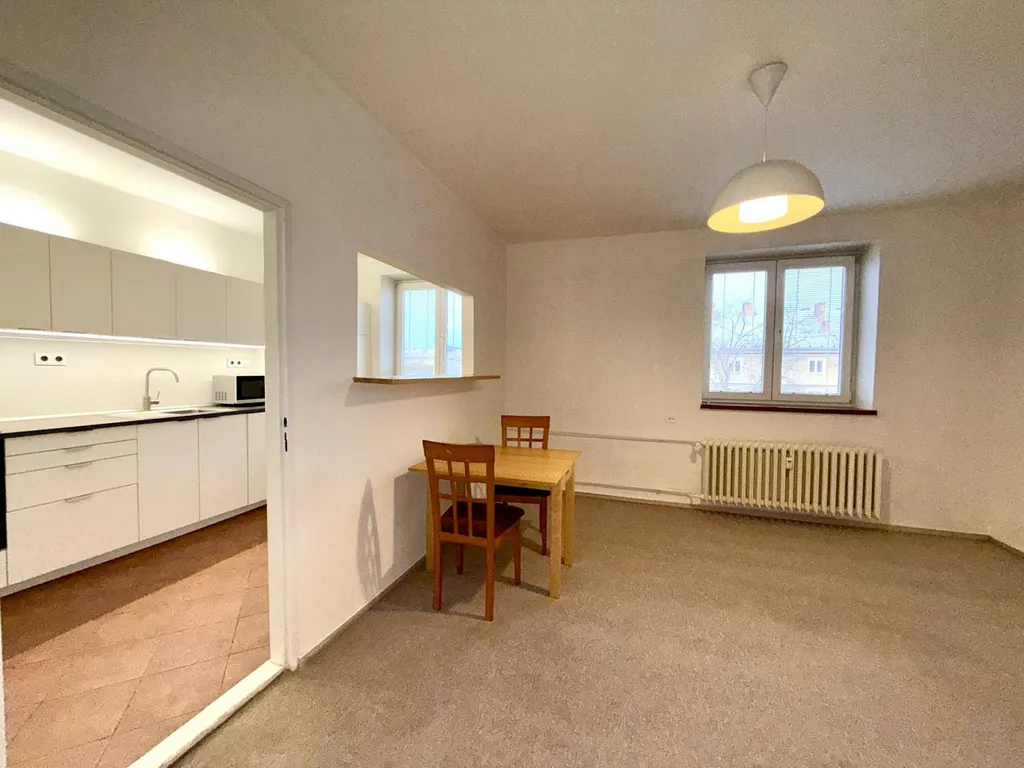 Byt má praktickou dispozici z kuchyně je vstup do obývacího pokoje přes dveře, kuchyně je zároveň propojena s obývacím pokojem servírovacím oknem. V kuchyni je vestavěná myčka nádobí, lednice s mrazákem, indukční varná deska, mikrovlnná trouby, digestoř. Dva další pokoje jsou samostatné. Součástí bytu je také komora s dostatkem úložného prostoru a přípojkou na pračku a sušičku.