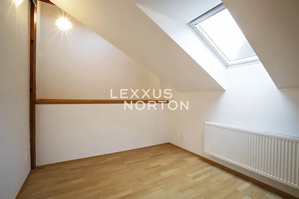 Tento nezařízený mezonet k pronájmu se sestává ze dvou pater. Přízemí dispozičně nabízí vstupní chodbu, prostorný obývací pokoj se vstupem na terasu a zahradu, dále je součástí této místnosti kuchyňský kout a jídelní prostor. Dále se na tomto patře nachází koupelna. První patro nabízí 3 samostatné ložnice, koupelnu, komoru a technickou místnost. V ceně nájmu je zahrnuto 1 parkovací místo v garáži.