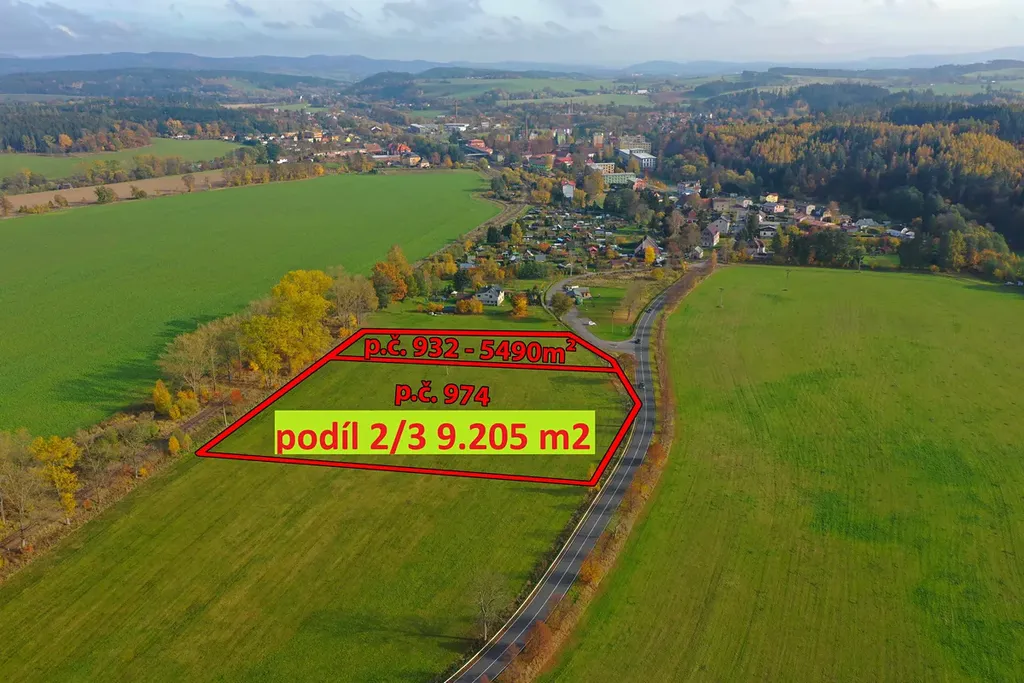 Prodávaná parcela číslo 932 je 5.490 m2 velká a je celá zahrnuta v územním plánu pro bydlení v rodinných domech, dále 2/3 podíl na parcele 974 činí 9.205 m2, který je v také zahrnut v územním plánování.