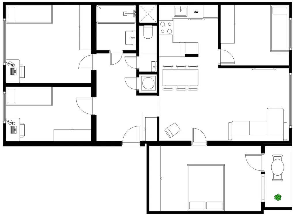 Dispozice nabízí prostorný obývací pokoj s kuchyňským koutem a čtyři samostatné pokoje vhodné jako ložnice, dětské pokoje nebo pracovna. Hlavní ložnice má přístup na lodžii o velikosti 3 m². Koupelna je vybavena sprchovým koutem, toaleta je oddělená. Vstupní chodba a technická místnost poskytuje dostatek místa pro úložné prostory. K bytu náleží sklep o velikosti 8 m².