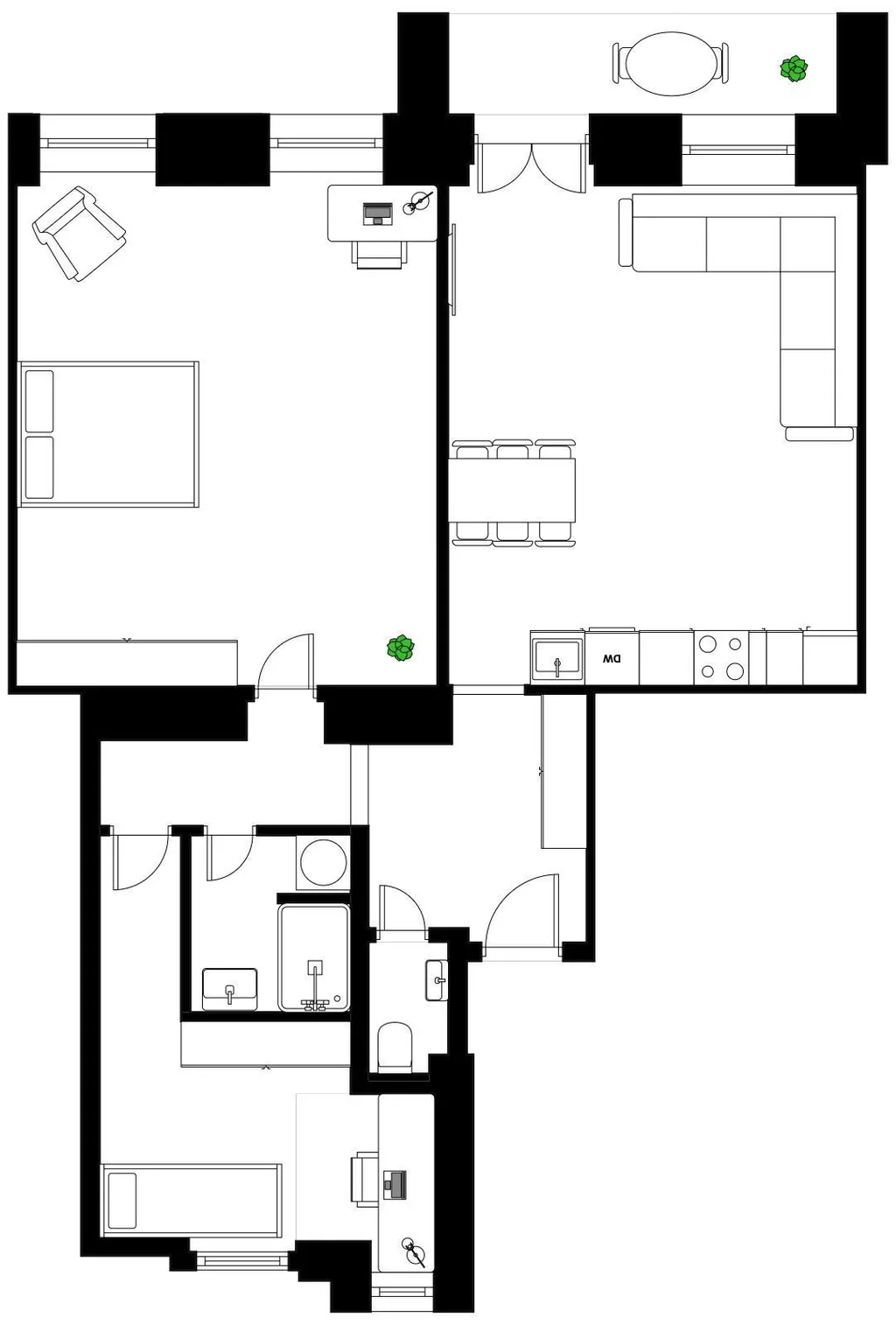 Dispozice bytu nabízí prostorný obývací pokoj s kuchyňským koutem a vstupem na balkón o velikosti 5 m², dvě samostatné ložnice, koupelnu se sprchovým koutem, samostatnou toaletu a vstupní chodbu s dostatkem úložného prostoru.