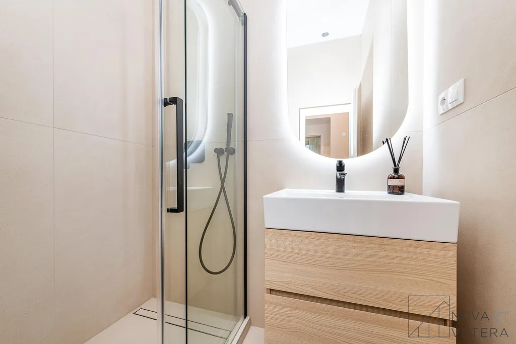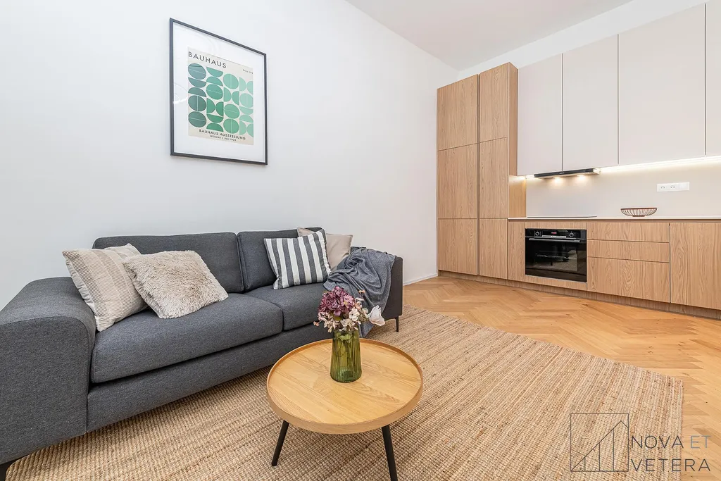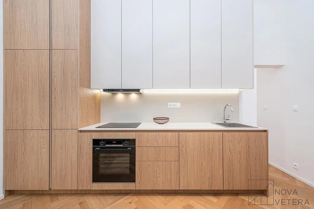 Byt právě prošel kompletní rekonstrukcí, která zahrnuje nové rozvody elektřiny, vody a odpadů, nová kastlová okna, moderní dřevěné podlahy , nové obklady a sanitu. Součástí vybavení je truhlářská kuchyňská linka na míru s prémiovými spotřebiči značky Bosch.
