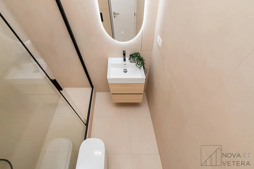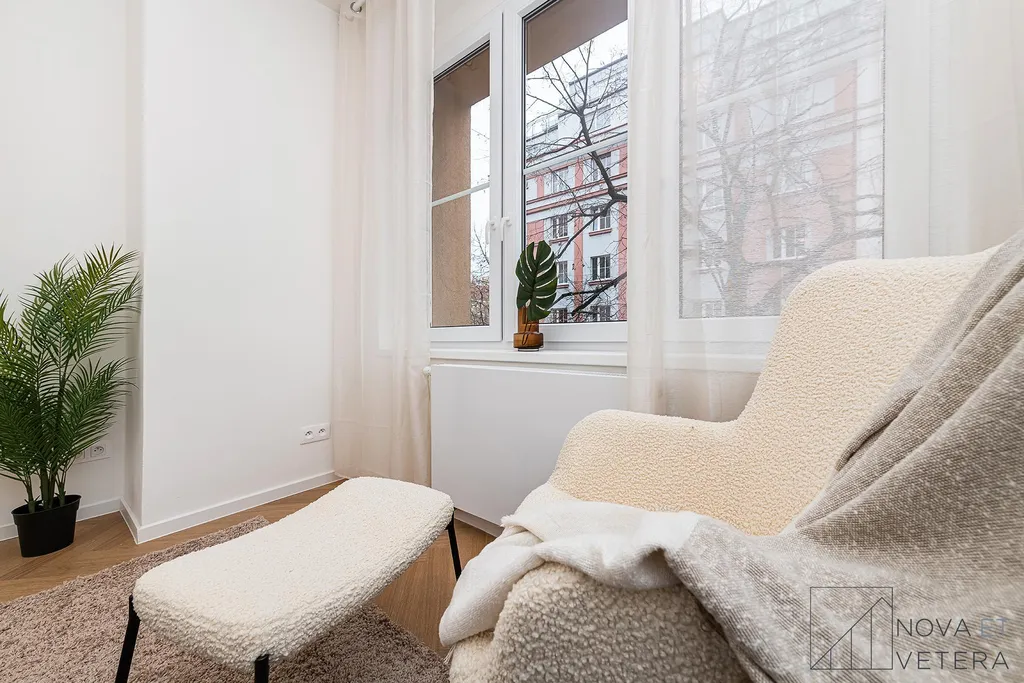 Byt právě prošel kompletní rekonstrukcí, která zahrnovala nové rozvody elektřiny, vody a odpadů, moderní podlahové krytiny, nové obklady a sanitu.Součástí vybavení je kuchyňská linka na míru se spotřebiči prémiové značky Bosch.
