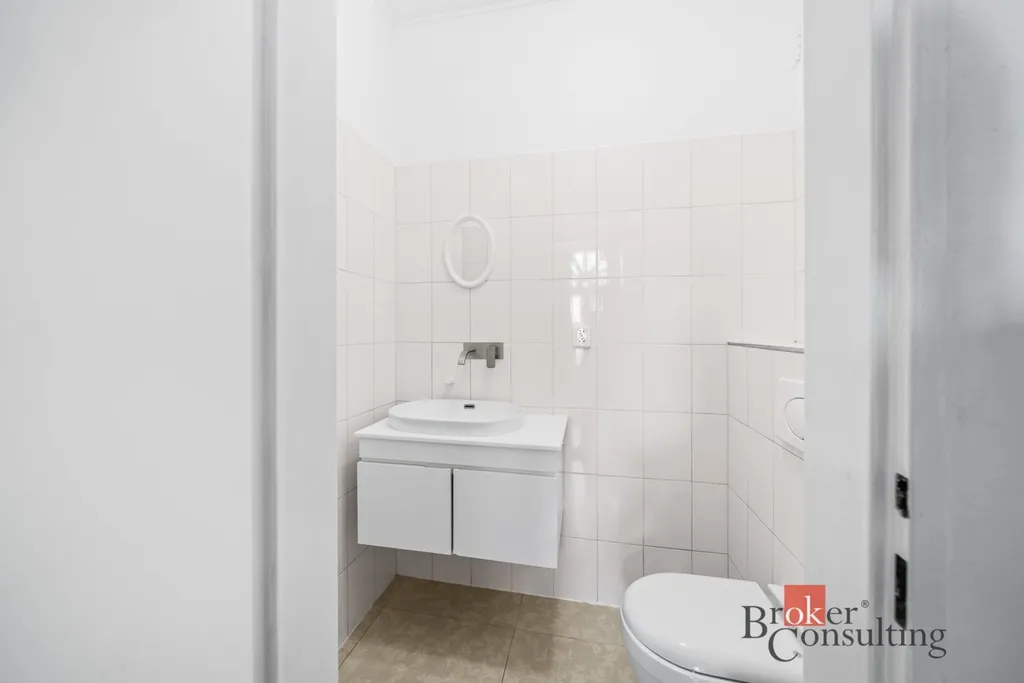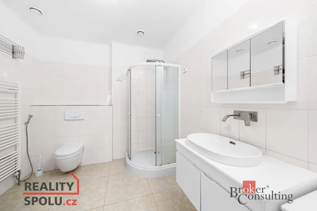Součástí bytu je koupelna se sprchovým koutem a WC o velikosti 7,6 m², dále samostatná toaleta (3,3 m²) a předsíň o velikosti 6 m² s možností úložných prostor.