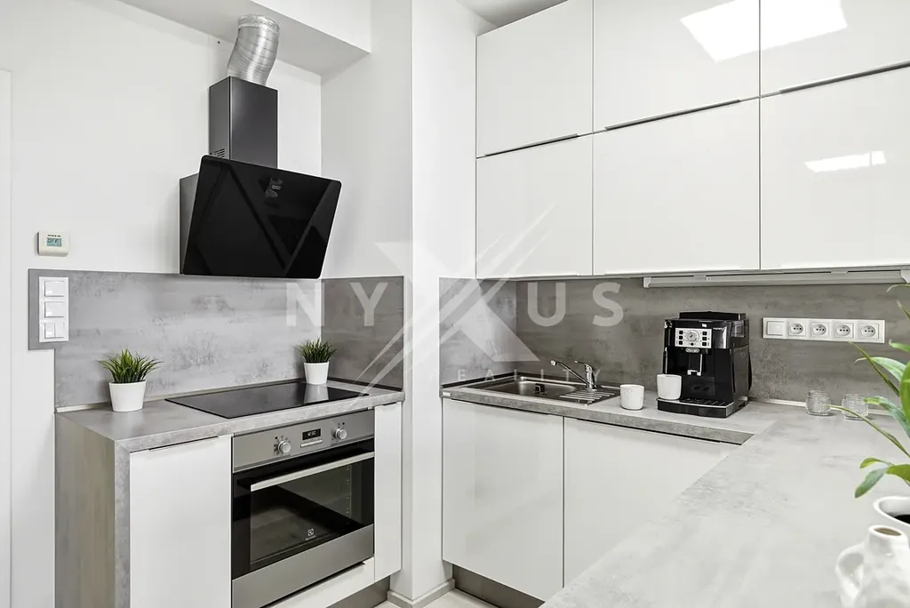 Byt se prodává včetně vybavení, takže je připravený k okamžitému nastěhování nebo k rychlému pronájmu bez dalších nákladů. Interiér je řešený chytře a prakticky – hned ve vstupní části najdete vestavěné úložné prostory na míru a elegantně integrovanou kombinovanou lednici. Moderní koupelna nabízí sprchový kout, WC, umyvadlo se zrcadlem, topný žebřík i pračku. Hlavní obytný prostor je vzdušný a díky promyšlenému členění přirozeně kombinuje kuchyňskou, jídelní, relaxační i spací zónu. Kuchyňská linka je plně osazená spotřebiči (indukce s digestoří, trouba, vestavná myčka, mikrovlnná trouba) a doplněná o dostatek úložných skříněk. Součástí vybavení je také dvoulůžko 200 × 200 cm, šatní skříň, jídelní stůl se dvěma židlemi, rohová sedací souprava a TV sestava.