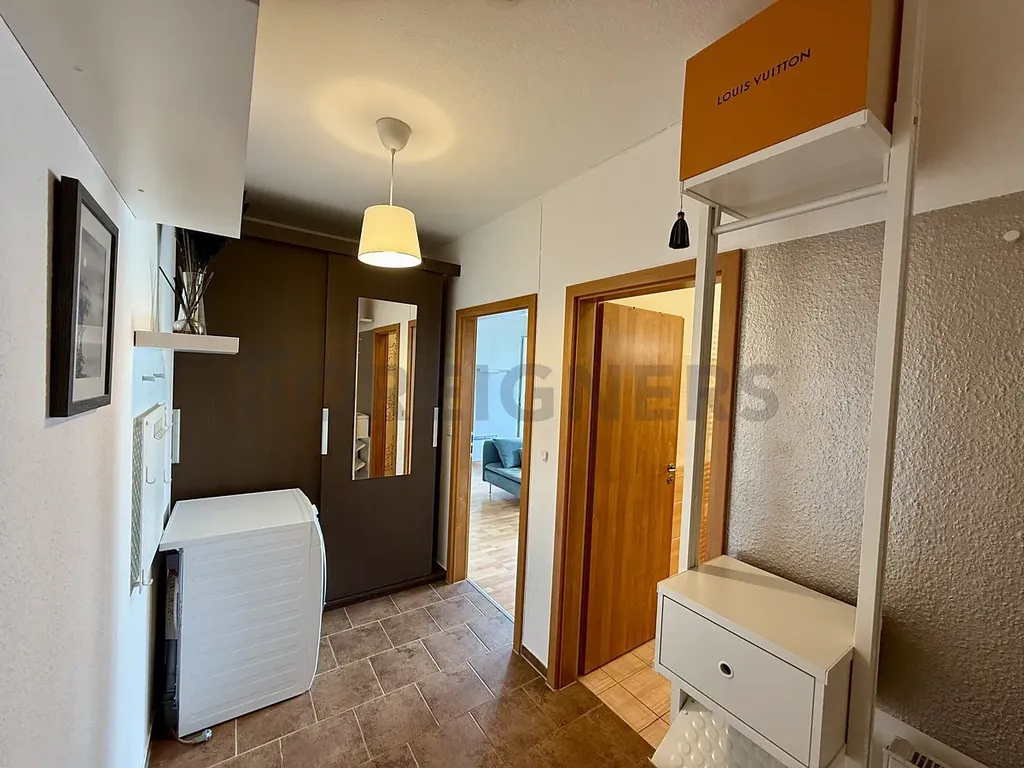 Byt je částečně zařízený nábytkem, televizí, kuchyňská linka včetně spotřebičů (myčka, trouba, mikrovlnka, vestavěné skříně, stůl a židle, pračka.