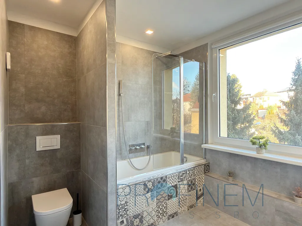 Koupelna je velmi prostorná a kromě vany a toalety zde najdete také připravený kout pro pračku a sušičku. Vstupní chodba nabízí další úložné možnosti a prostor na botník. V celém bytě je moderní osvětlení a kvalitní podlahy, díky nimž působí interiér jednotně a elegantně. K dispozici je také sklep v suterénu domu.