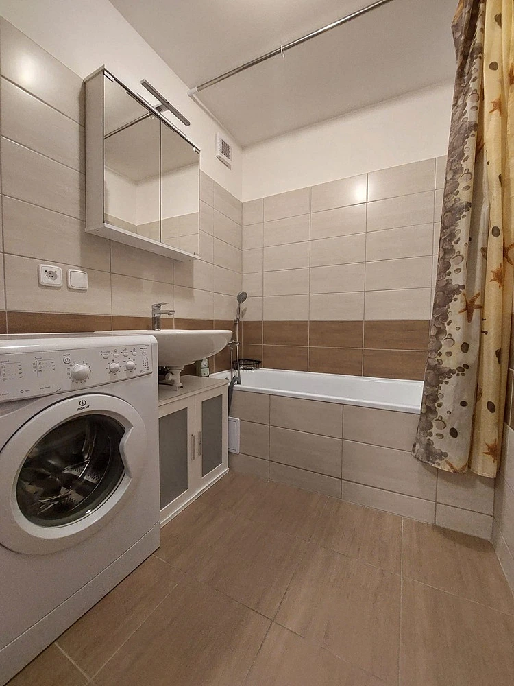 Nabízí se částečně zařízený, je zde pouze zánovní kuchyňská linka s kombinovaným sporákem, digestoř, lednice, myčka nádobí, mikrovlnná trouba, jídelní stůl a židle, v pokoji 2 komody, pračka, šatní skříň a věšáková stěna v předsíni.
