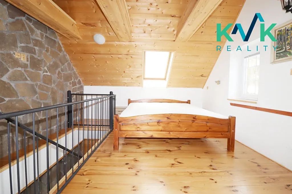 Podkroví: ložnice s dvoulůžkem, druhá místnost s lůžkem a skříní.