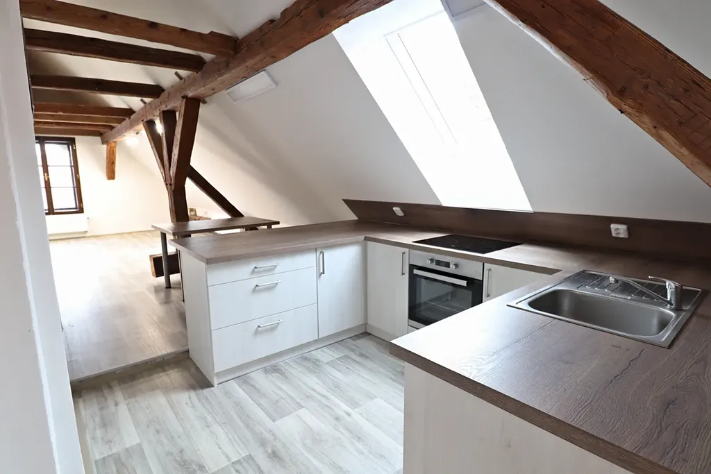 Nabízíme k pronájmu bytovou jednotku 2+kk, která se nachází ve třetím nadzemním podlaží zrekonstruovaného historického domu. Dům prošel v posledních letech celkovou rekonstrukcí. Bytová jednotka je zařízena kuchyňskou linkou se sklokeramickou deskou, troubou myčkou. Dále je zde pračka, sušička, postel, šatní skříň a jídelní stůl se židlemi. Měsíční nájem činí 12.000,-Kč plus energie a služby 4.000,-Kč. Kauce 24.000,-Kč plus odměna RK. Máme zájem o slušné pracující nájemníky bez domácích mazlíčků.