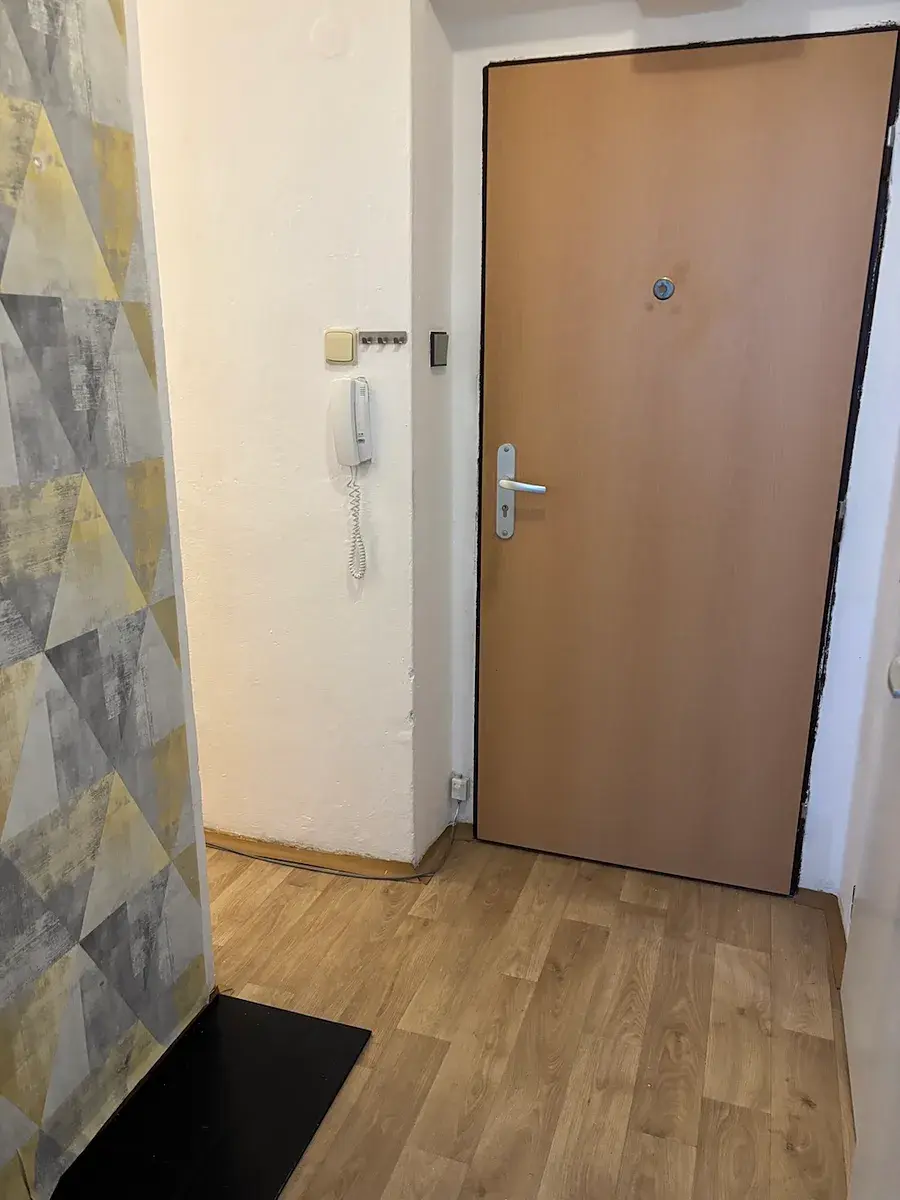 Dispozice bytu: kuchyň s balkónem, pokoj, předsíň s vestavěnou skříní, koupelna, WC.