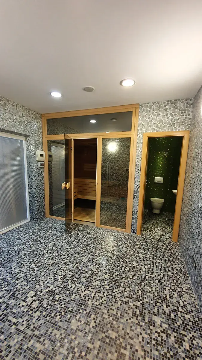 sauna, odpočinková místnost, WC pro saunu a bazén, úklidová místnost, sklad sportovních potřeb, WC, zimní zahradka.